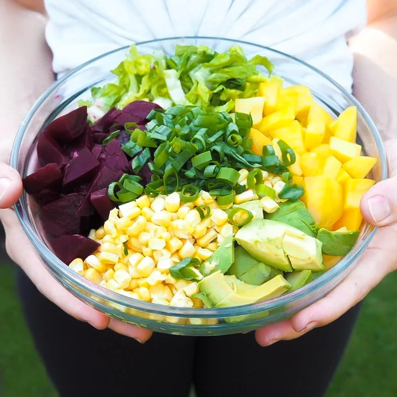 Well I think this salad recipe tastes exactly like summer on a plate. The combination of flavours and textures are just super delicious and go so well together. I love the crisp romaine lettuce and juicy sweet mangoes they go lovely together with the crunchiness of the sweetcorn and smoothness of the avocado. Everything is just right!